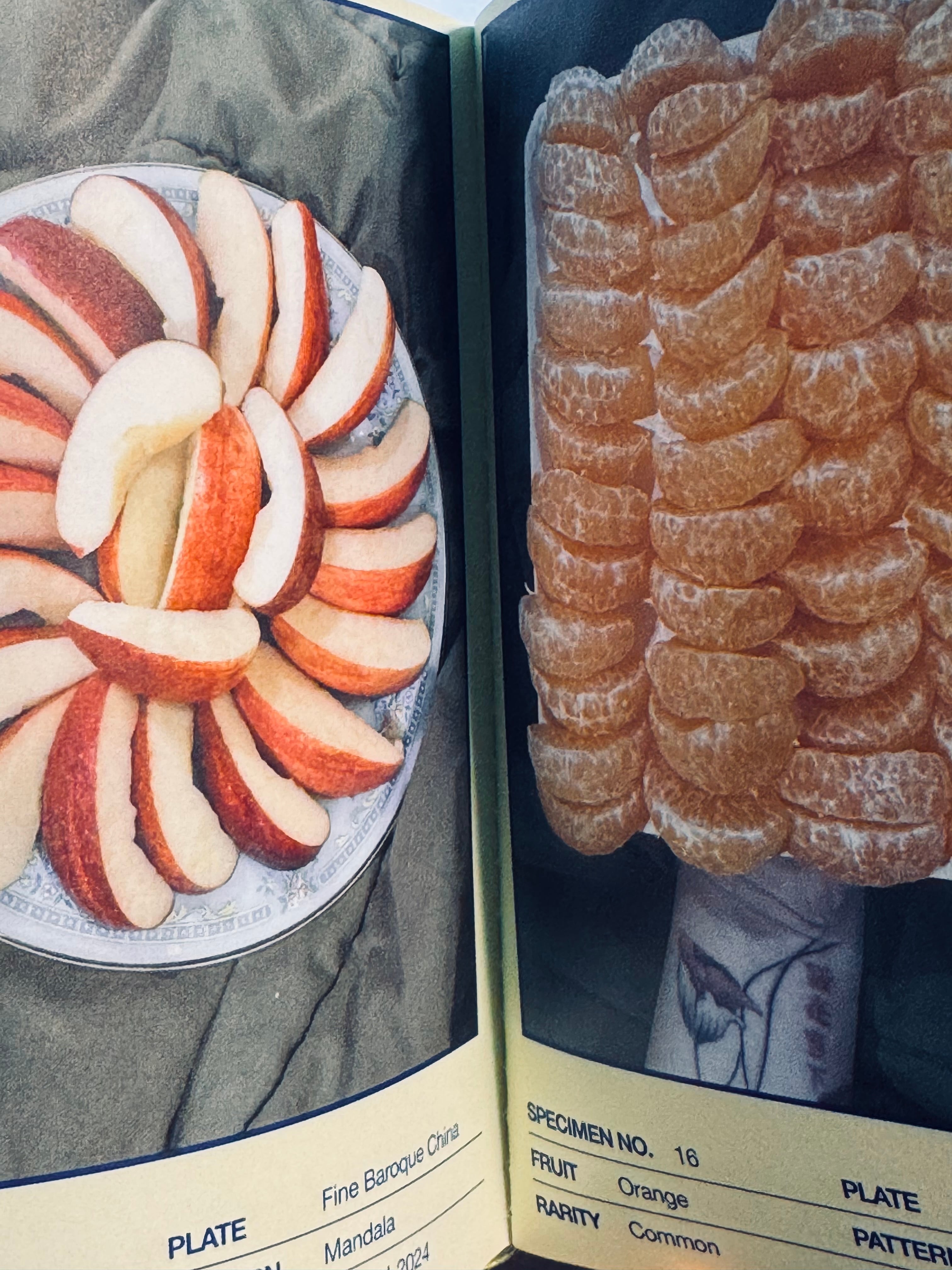 片方から読むと、脱ぎ捨てられたズボンたちが並びますが、もう片方から見ていくとそこには綺麗に並べられたフルーツが並んでいるという面白い写真集です。
