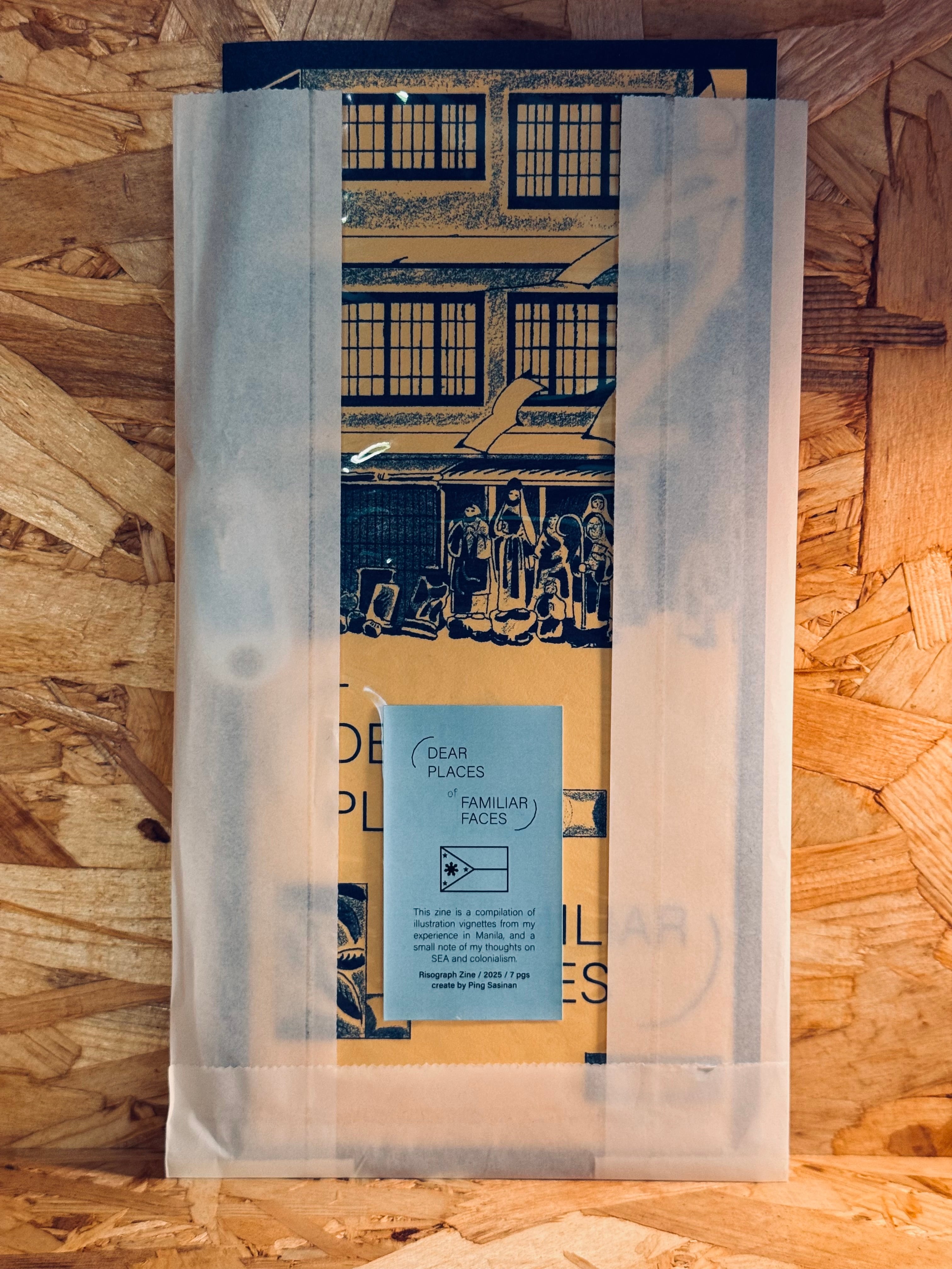 (リソグラフZINE / 2025年 / 7ページ) リソグラフ技法で印刷された挿絵集で、マニラでの思い出と、東南アジア(SEA)および植民地主義の影響に対する作者の考えを綴った短いメモが描かれています。 このリソZINEは、マニラでのささやかな思い出のイラストと、東南アジアに対する私たちの感情や植民地支配の影響についての短いエッセイを集めたものです。