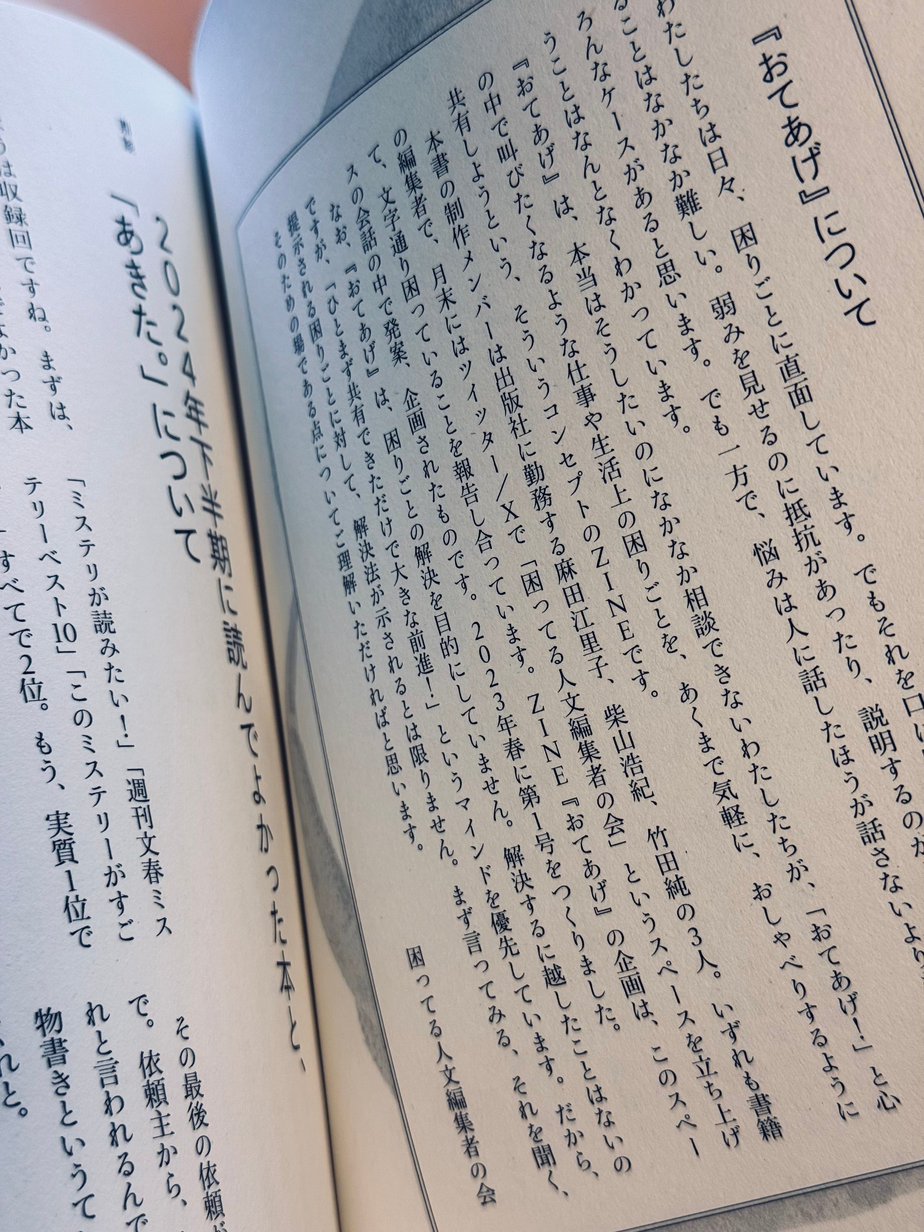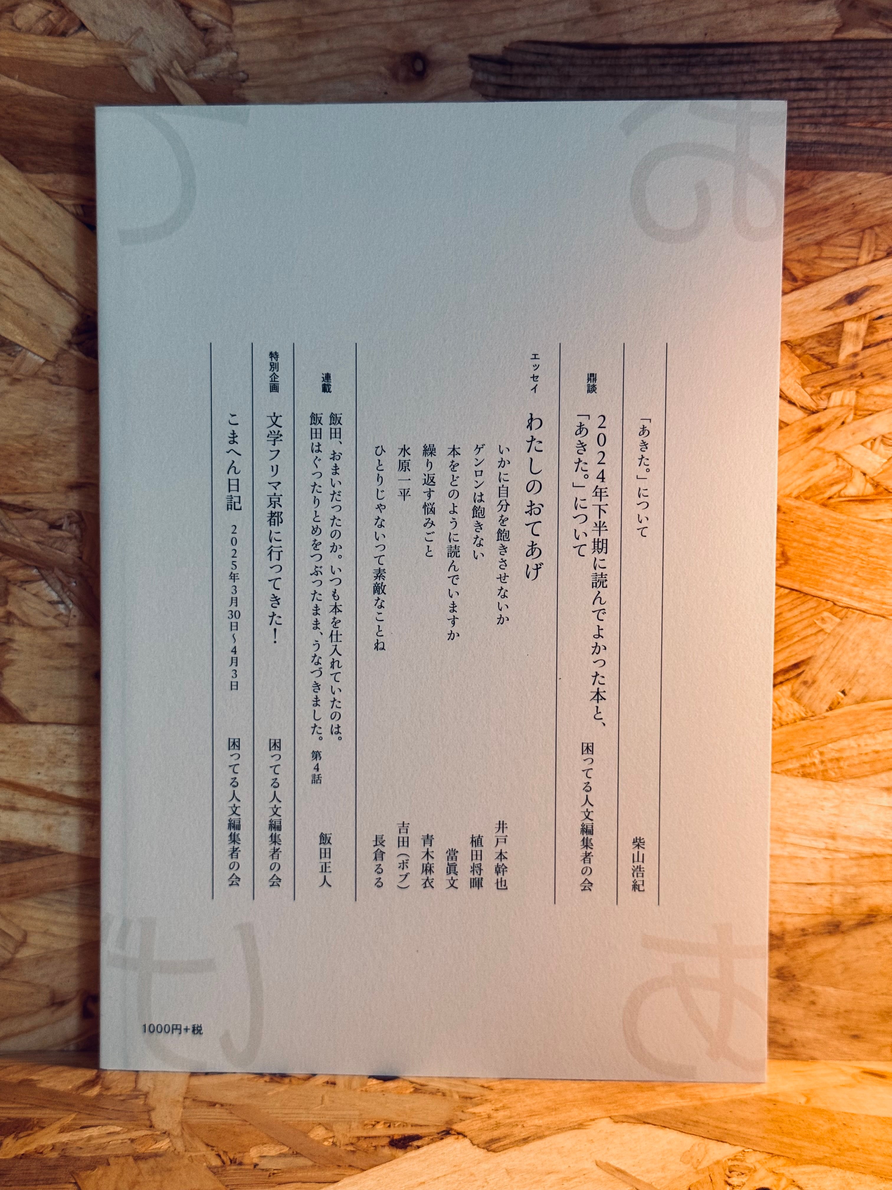 巻頭言では、さんの柴山浩紀さんが「あきた。」という感覚についての考えを語り、続く座談会では2024年下半期に読んでよかった本と「あきた。」というテーマについて「困ってる人文編集者の会」のメンバーが話し合っています。