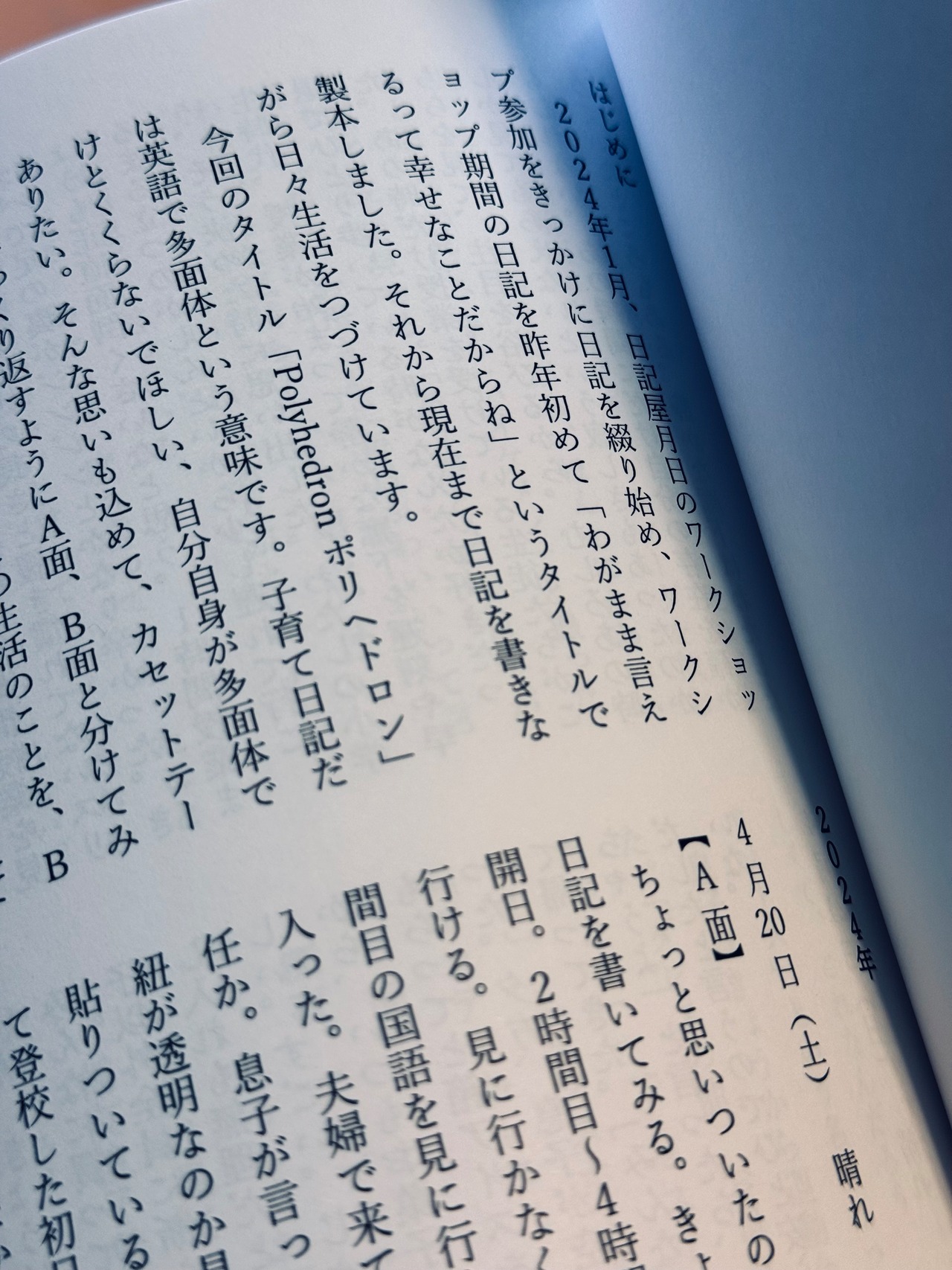 今回のタイトル「Polyhedron ポリヘドロン」は英語で多面体という意味です。子育て日記だけとくくらないでほしい、自分自身が多面体でありたい。そんな思いも込めて、カセットテープをひっくり返すようにA面、B面と分けてみました。A面には子どもとの生活のことを、B面には四十代の自分自身のことを中心にあえて書き分けたつもりです。そのことをちょっと頭の片隅に置いて、読んでもらえる嬉しいです。