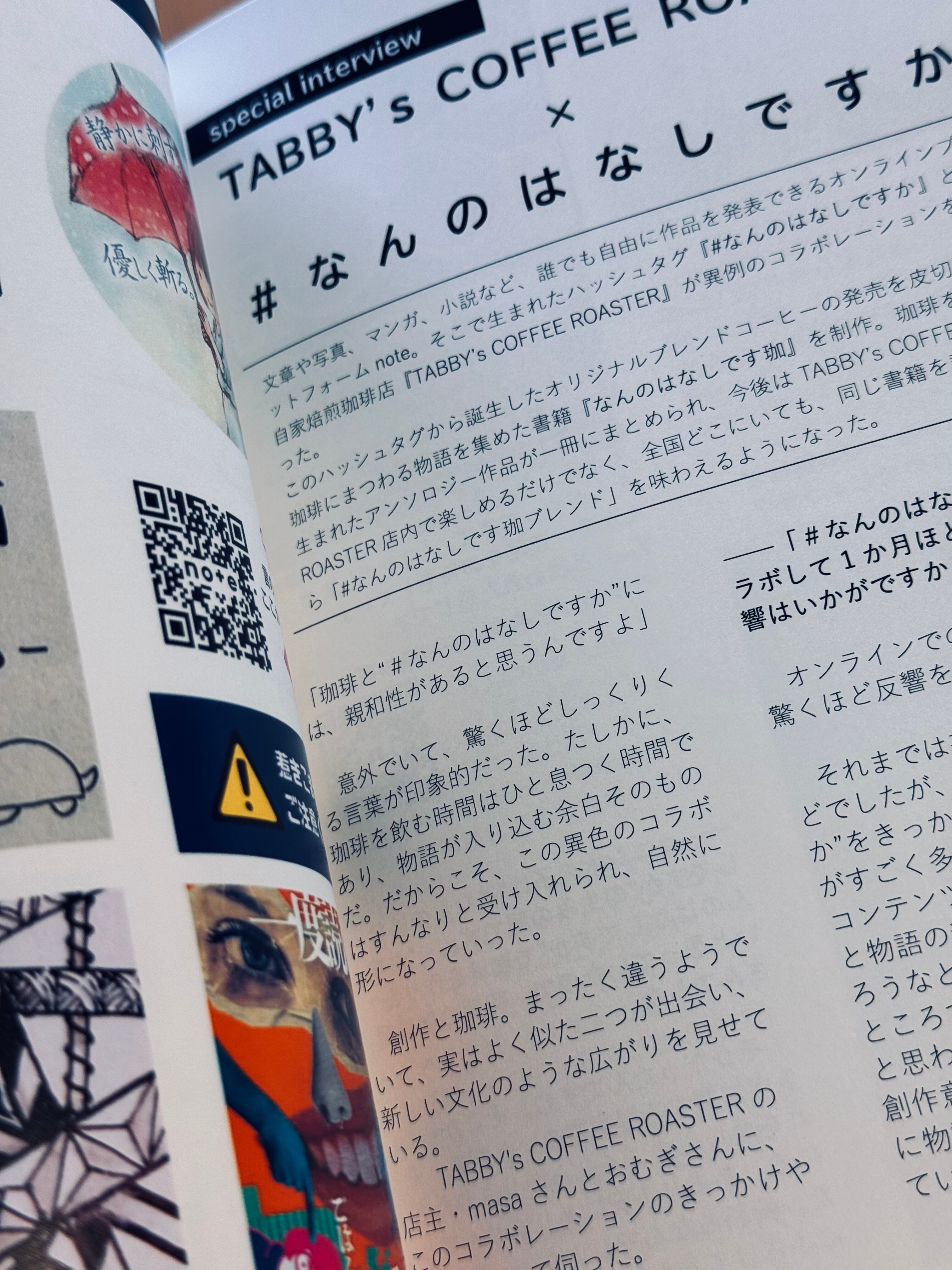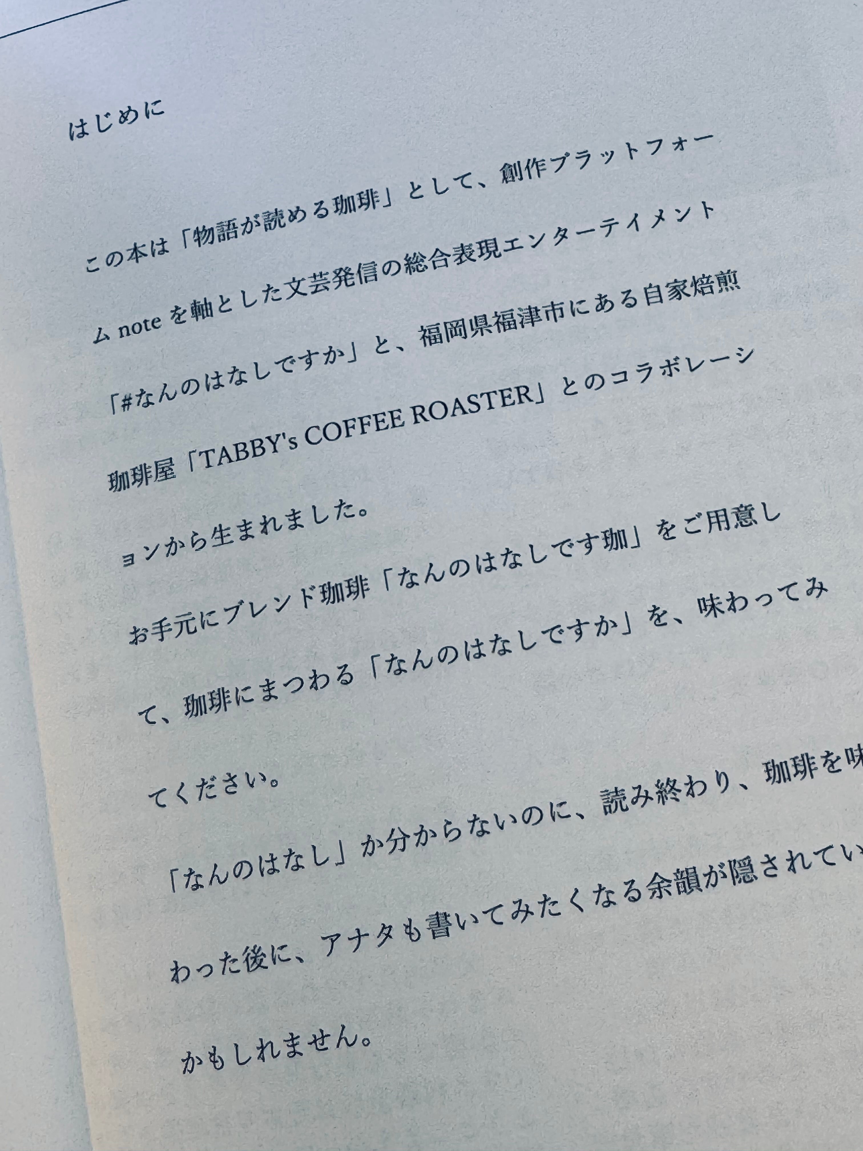 福岡県福津市にある自家焙煎珈琲屋「TABBY's COFFEE ROASTER」さんと、noteから生まれた文芸ムーブメント「#なんのはなしですか」が溶け合って、一杯のカップに注がれました。本書は、その素敵なコラボレーションから生まれた一冊です。